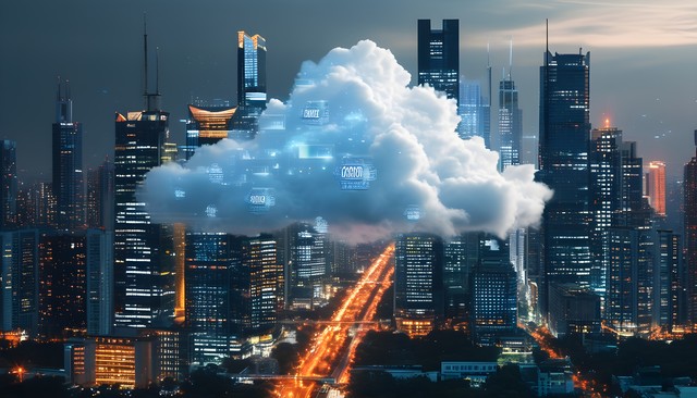 数字云计算和技术概念,手握平板灯光绚丽的虚拟场景。