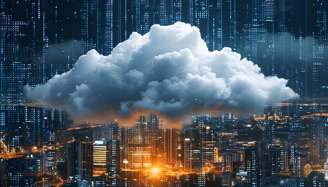 数字云计算和技术概念,手握平板灯光绚丽的虚拟场景。