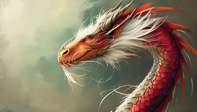 威武的红色龙在山脉间盘旋,背景是宁静的自然景色