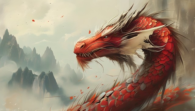威武的红色龙在山脉间盘旋,背景是宁静的自然景色
