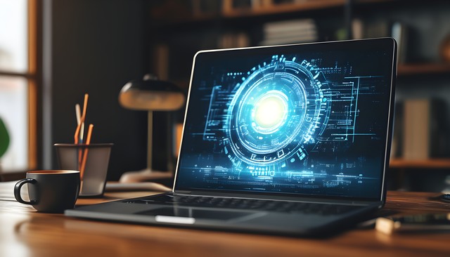一位女性在电脑前工作,屏幕上显示着科技感十足的数据界面。