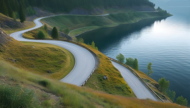 蜿蜒的山路沿着宁静的湖泊与青翠的山坡,展现自然的宁静与美丽。