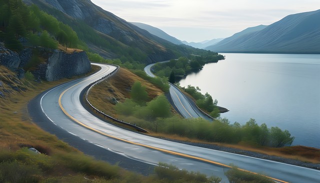 蜿蜒的山路沿着宁静的湖泊与青翠的山坡,展现自然的宁静与美丽。