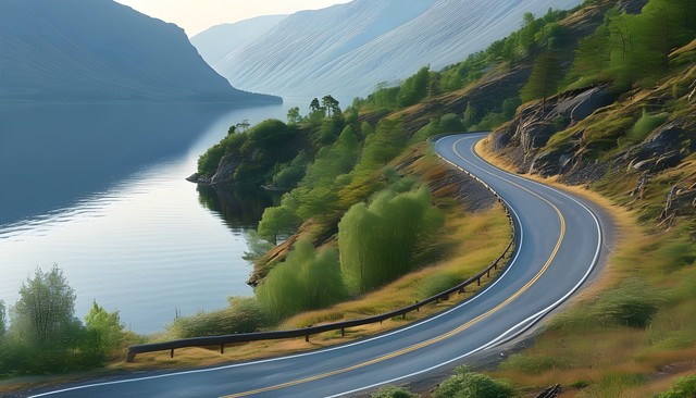 蜿蜒的山路沿着宁静的湖泊与青翠的山坡,展现自然的宁静与美丽。