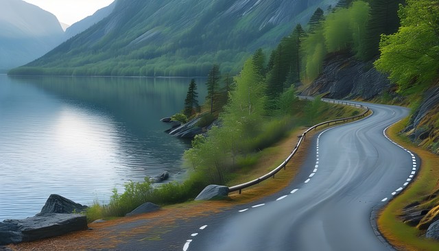 蜿蜒的山路沿着宁静的湖泊与青翠的山坡,展现自然的宁静与美丽。