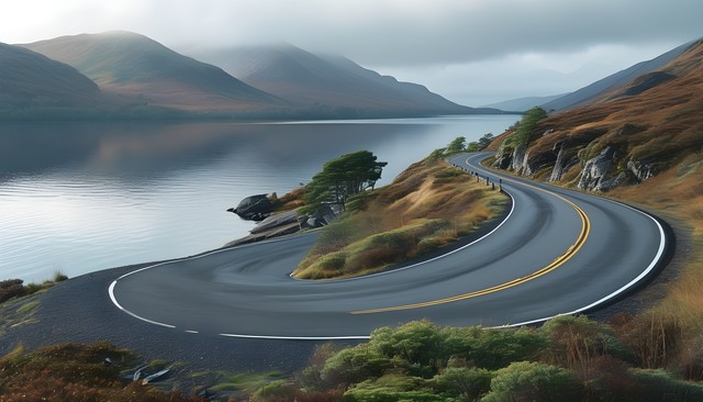 蜿蜒的山路沿着宁静的湖泊与青翠的山坡,展现自然的宁静与美丽。
