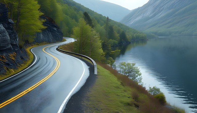 蜿蜒的山路沿着宁静的湖泊与青翠的山坡,展现自然的宁静与美丽。