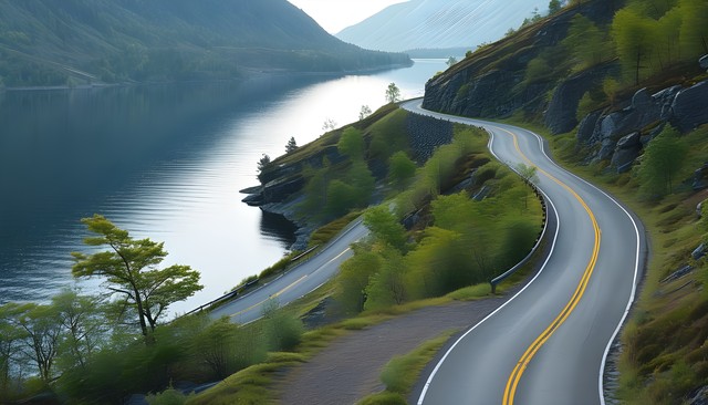 蜿蜒的山路沿着宁静的湖泊与青翠的山坡,展现自然的宁静与美丽。