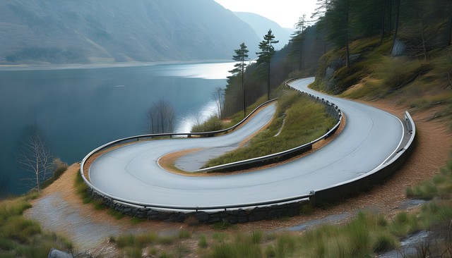 蜿蜒的山路沿着宁静的湖泊与青翠的山坡,展现自然的宁静与美丽。