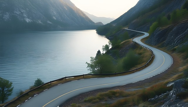 蜿蜒的山路沿着宁静的湖泊与青翠的山坡,展现自然的宁静与美丽。