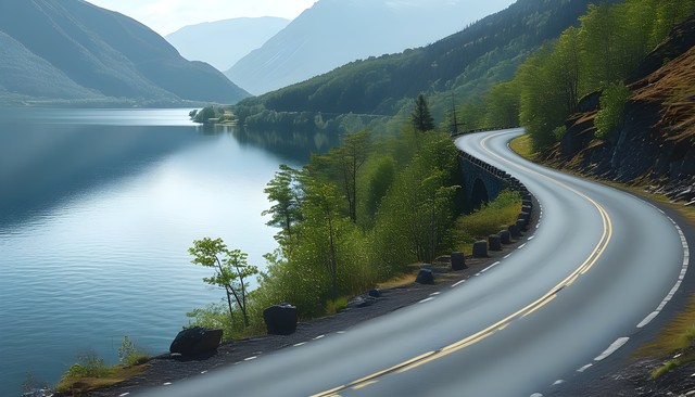 蜿蜒的山路沿着宁静的湖泊与青翠的山坡,展现自然的宁静与美丽。