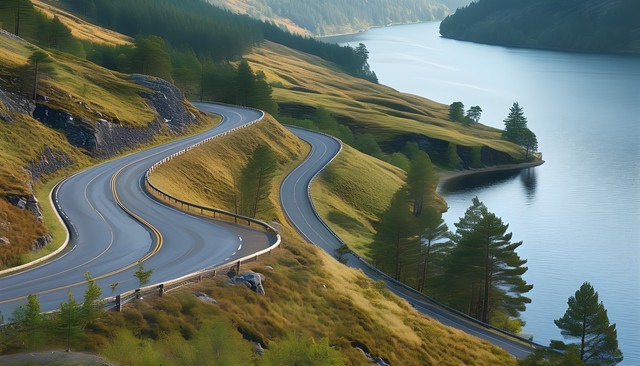蜿蜒的山路沿着宁静的湖泊与青翠的山坡,展现自然的宁静与美丽。