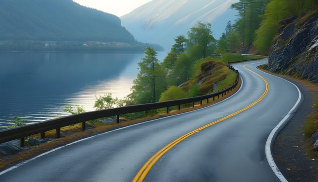 蜿蜒的山路沿着宁静的湖泊与青翠的山坡,展现自然的宁静与美丽。