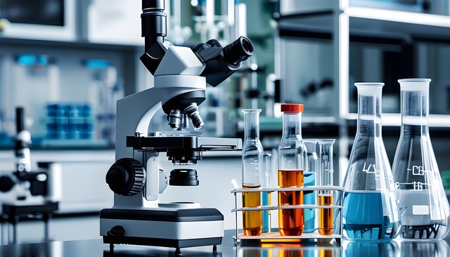 实验室内的显微镜与各类化学试剂瓶,展现科研氛围。