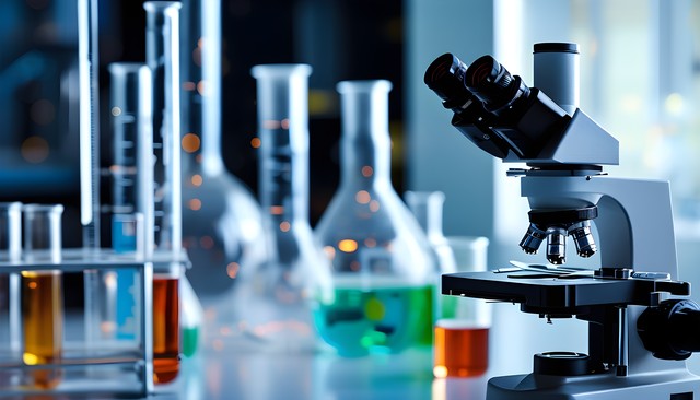 实验室内的显微镜与各类化学试剂瓶,展现科研氛围。