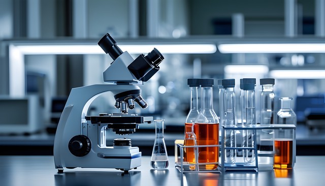 实验室内的显微镜与各类化学试剂瓶,展现科研氛围。