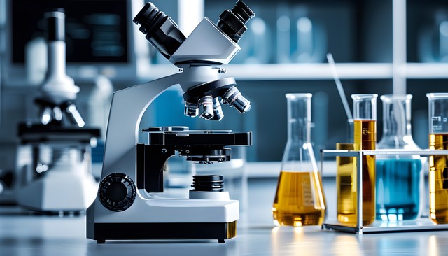 实验室内的显微镜与各类化学试剂瓶,展现科研氛围。