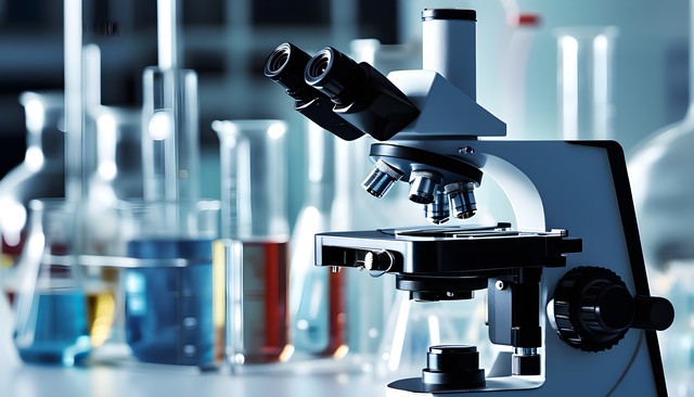 实验室内的显微镜与各类化学试剂瓶,展现科研氛围。