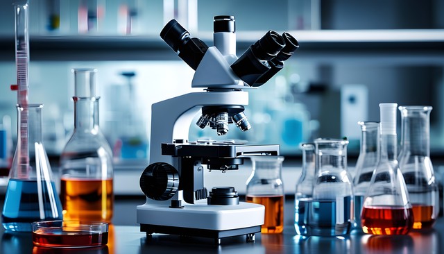 实验室内的显微镜与各类化学试剂瓶,展现科研氛围。