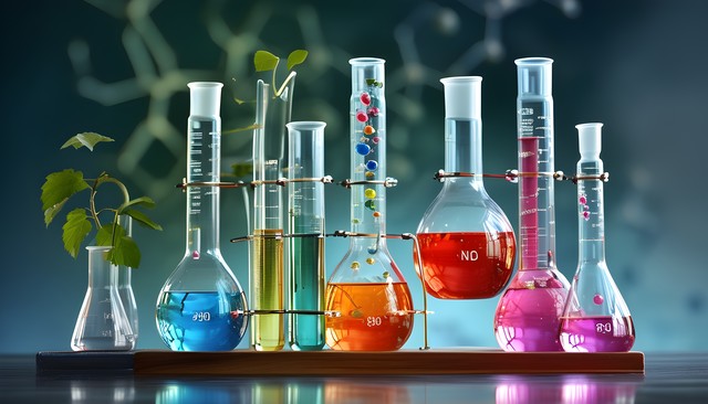 实验室中的多种玻璃器皿,装有蓝色液体,背景为书架和植物
