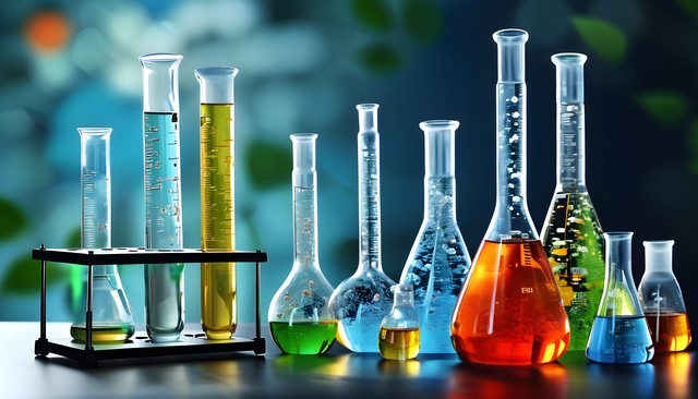 实验室中的多种玻璃器皿,装有蓝色液体,背景为书架和植物