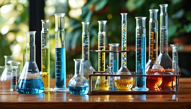 实验室中的多种玻璃器皿,装有蓝色液体,背景为书架和植物