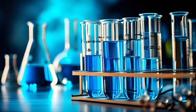 实验室中的试管架,上面放置着盛有蓝色液体的试管。