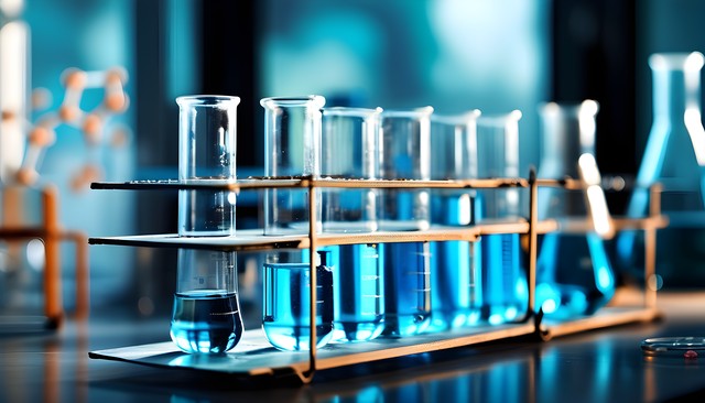实验室中的试管架,上面放置着盛有蓝色液体的试管。