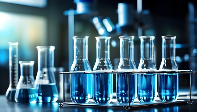 实验室中的试管架,上面放置着盛有蓝色液体的试管。