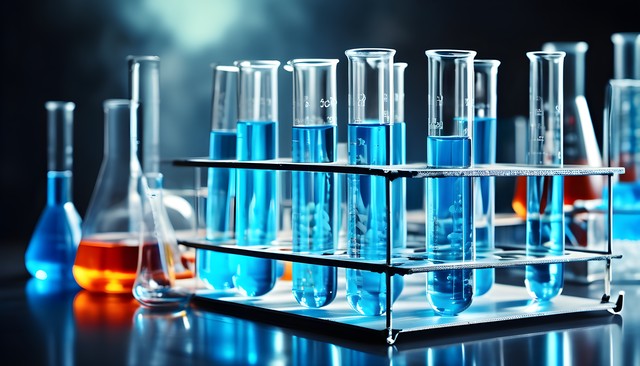 实验室中的试管架,上面放置着盛有蓝色液体的试管。
