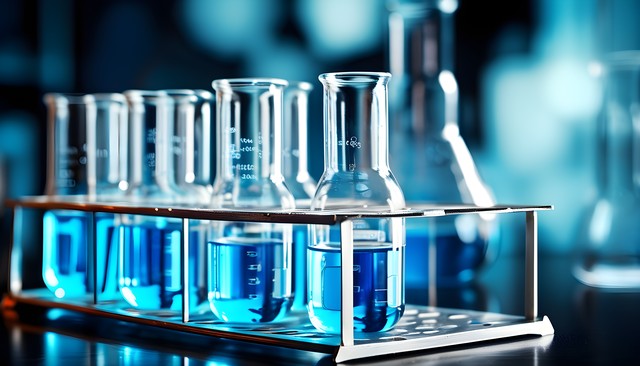 实验室中的试管架,上面放置着盛有蓝色液体的试管。