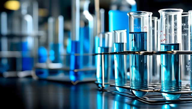 实验室中的试管架,上面放置着盛有蓝色液体的试管。