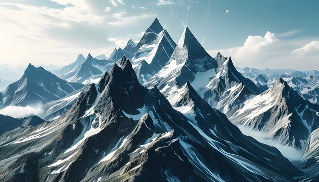 高耸入云的雪山与科技感的元素结合,形成壮丽的自然与未来感景观。
