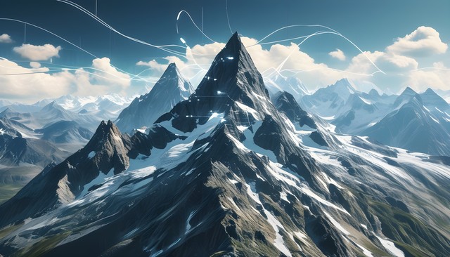 高耸入云的雪山与科技感的元素结合,形成壮丽的自然与未来感景观。