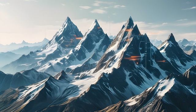 高耸入云的雪山与科技感的元素结合,形成壮丽的自然与未来感景观。