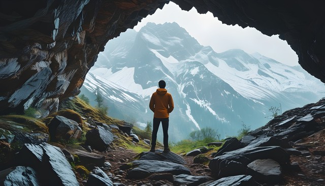 从山洞中看到的壮丽山景与一个黑影剪影,营造出探险与自然交融的感觉。