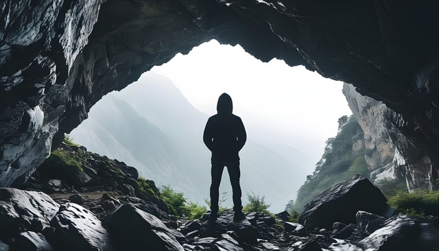 从山洞中看到的壮丽山景与一个黑影剪影,营造出探险与自然交融的感觉。