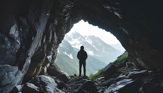 从山洞中看到的壮丽山景与一个黑影剪影,营造出探险与自然交融的感觉。