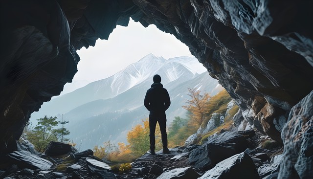 从山洞中看到的壮丽山景与一个黑影剪影,营造出探险与自然交融的感觉。