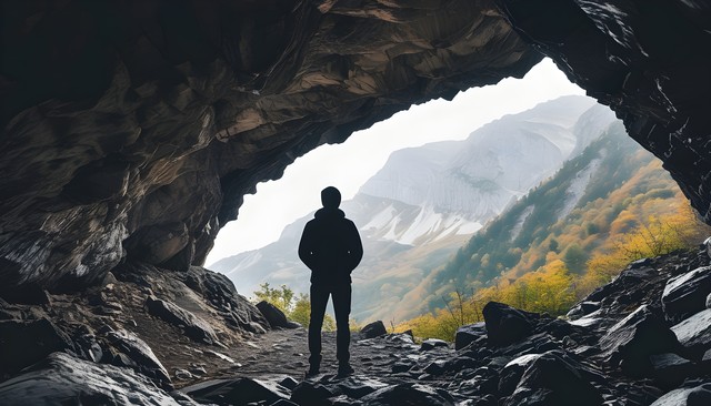 从山洞中看到的壮丽山景与一个黑影剪影,营造出探险与自然交融的感觉。