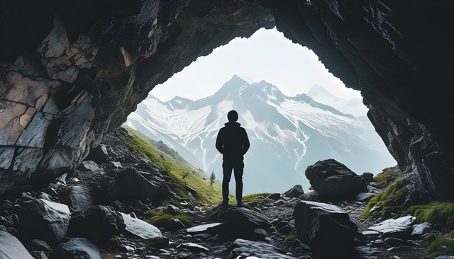 从山洞中看到的壮丽山景与一个黑影剪影,营造出探险与自然交融的感觉。