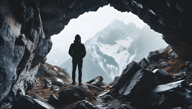 从山洞中看到的壮丽山景与一个黑影剪影,营造出探险与自然交融的感觉。
