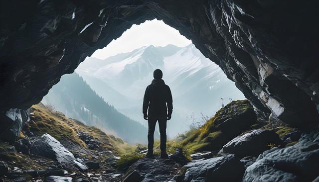 从山洞中看到的壮丽山景与一个黑影剪影,营造出探险与自然交融的感觉。