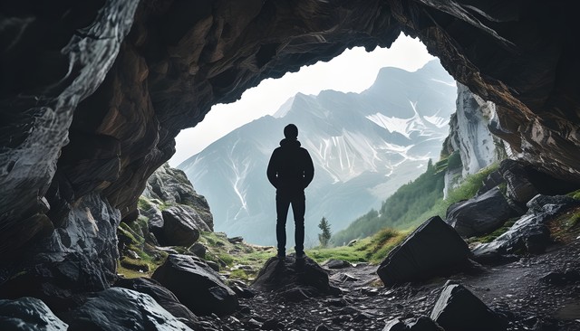 从山洞中看到的壮丽山景与一个黑影剪影,营造出探险与自然交融的感觉。