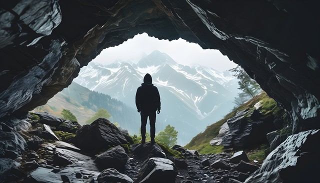 从山洞中看到的壮丽山景与一个黑影剪影,营造出探险与自然交融的感觉。