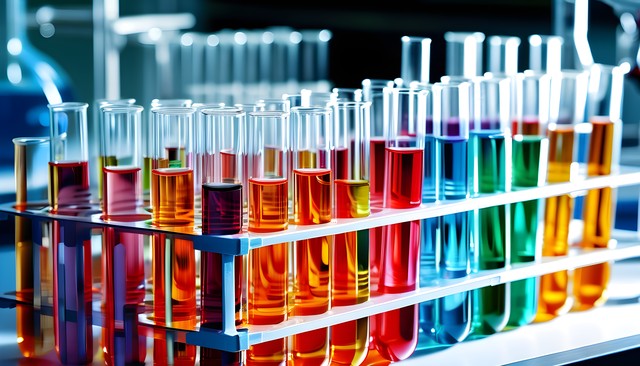 色彩斑斓的试管展示在实验室工作台上,四周显得非常专业。