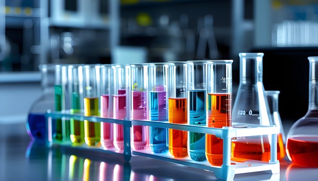 色彩斑斓的试管展示在实验室工作台上,四周显得非常专业。