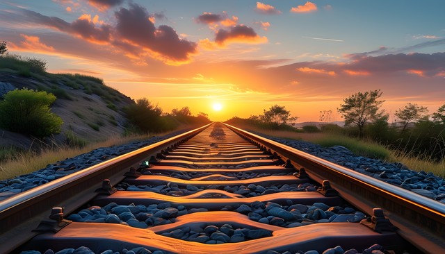 夕阳西下的铁路,伴随美丽的云彩与草木,展现自然的宁静与和谐。
