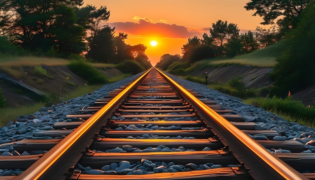 夕阳西下的铁路,伴随美丽的云彩与草木,展现自然的宁静与和谐。
