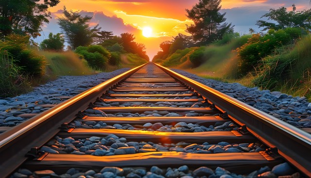 夕阳西下的铁路,伴随美丽的云彩与草木,展现自然的宁静与和谐。